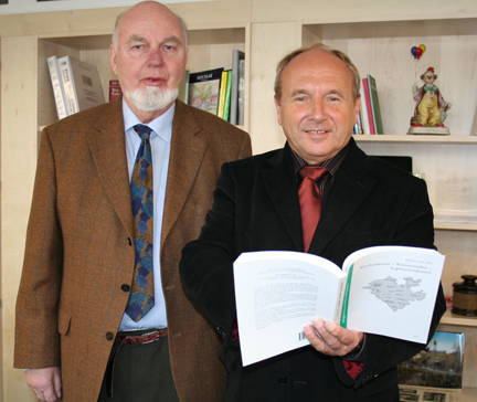 Helmut Geck übergibt Landrat Jochen Welt die kirchengeschichtliche Buchneuerscheinung